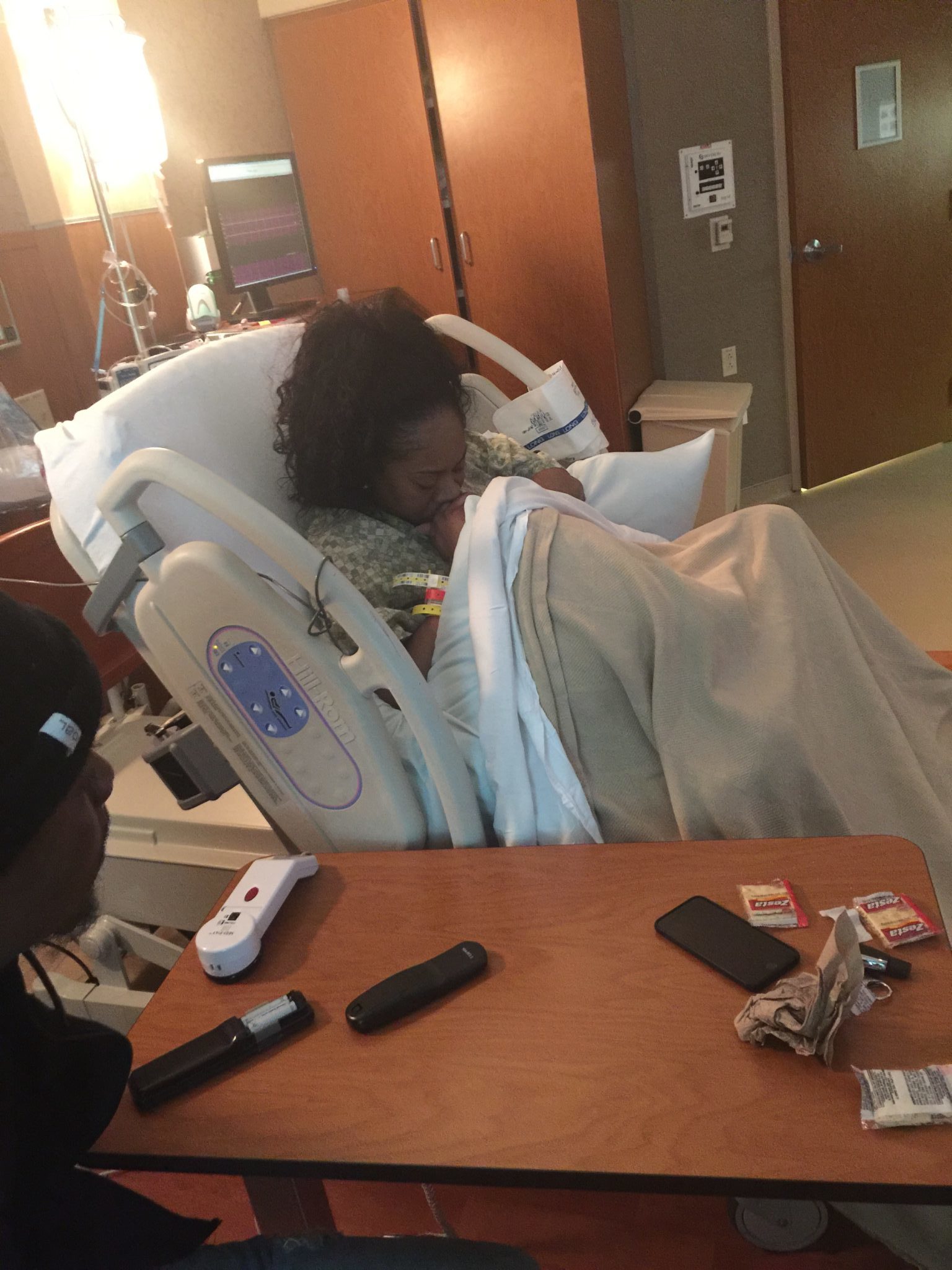 I have the most amazing OB, she’s very mid-wife-esque. She’s all about a natural birth as long as that’s what I wanted. She told me ahead of time if I changed my mind she would remind mewhat I told her I wanted but if I insisted she would give me meds. I never changed my mind. I remember he voice was very soothing she kept reminding me I was the one who could get my son here, so we could meet him. Her words made me feel strong. Sanya was the best assistant coach she went between holding my leg when I was pushing while sternly screaming encouraging words like “you can do this”, “PUSH SHEZ”! To gently caressing my leg while I was in between contractions. Tyrell is the strong silent type, he held my other leg and kissed my forehead softly every now and then to let me know he was proud of me. And my mom stayed out of the way as much as possible but walked over to me every so often say a word or two then sit back down. My nurses were so encouraging they held my hands and made me feel confident.