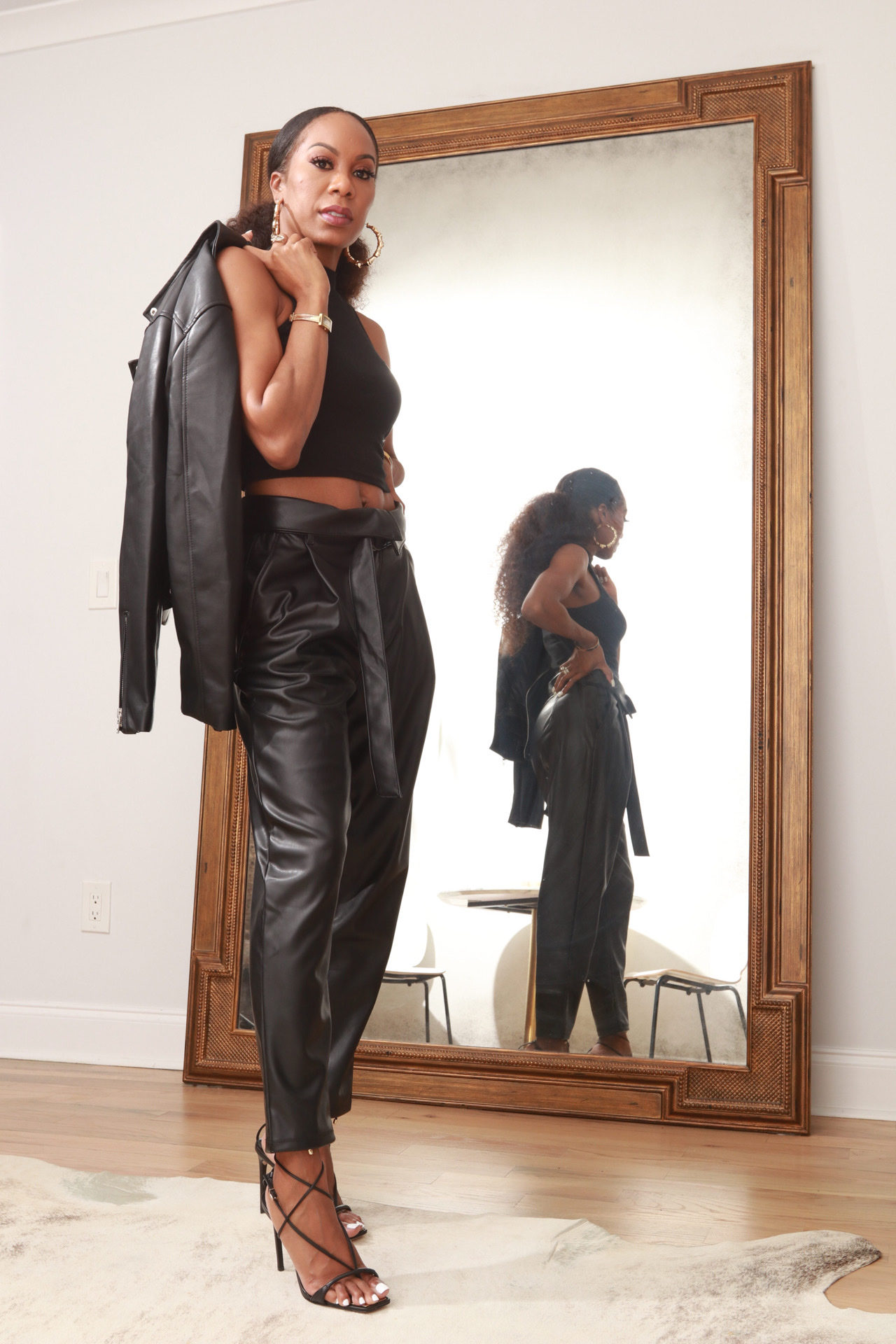 As I continue my transition from athlete to TV personality I get calls and opportunities all the time to meet new people. Since we all know you only get one chance to make a first impression, I try to make the most of it every time! I told Virgina, I wanted something strong, and bold! I wanted to OWN the room and she delivered! This black leather number is EVERYTHING!